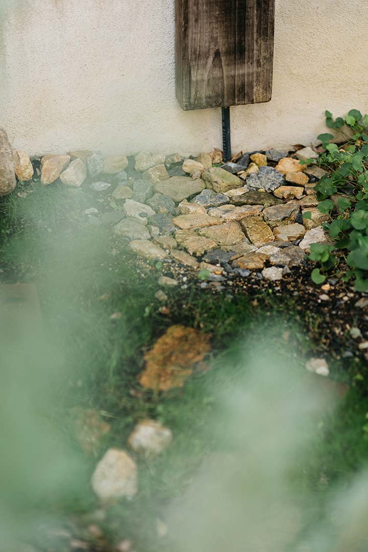 この水栓の下の石は、あちこちで拾ってきたものを並べたんですよ。