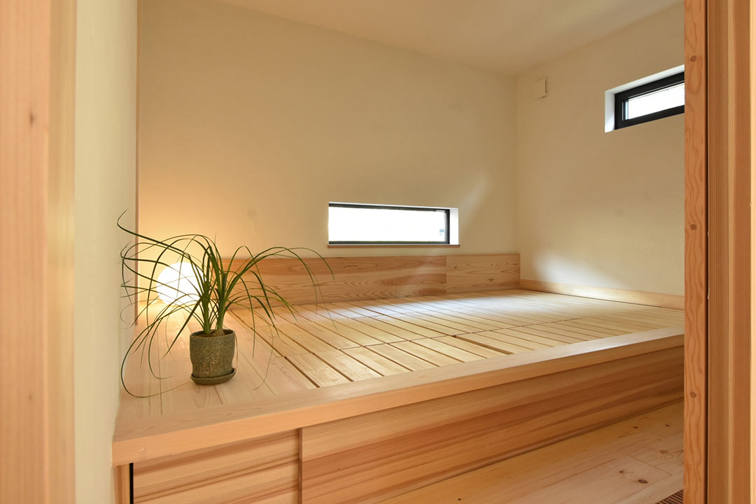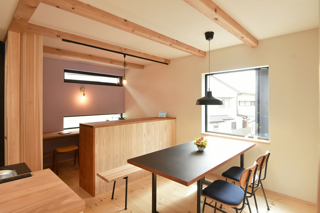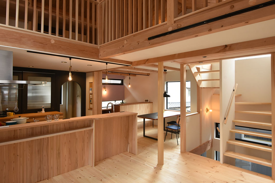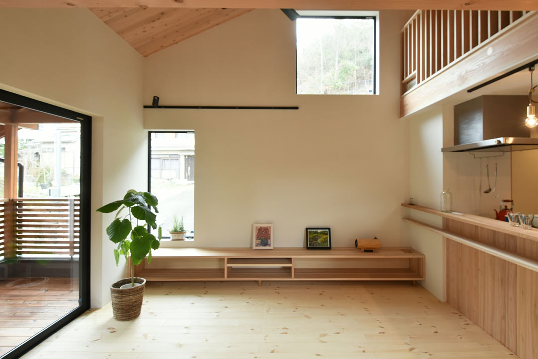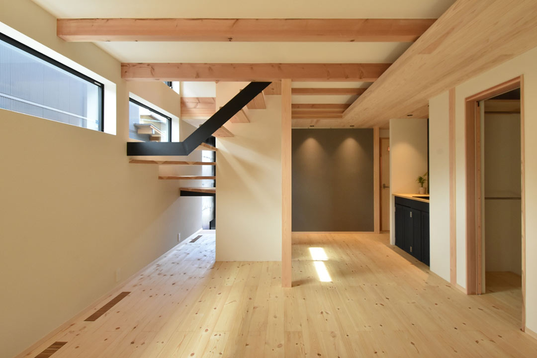 二ヶ月ほど後のある日。とある中古物件を自転車で拝見した帰り道に、ふと目に飛び込んできた「新築見学会開催中」のノボリ。玄関が開放されており、道路脇からもお宅の中の様子が見えます。無垢の木の内装の雰囲気の良いお宅。妻が希望する家の条件である「無垢の木を使った自然素材の家」でした。普段は、下調べを入念にしないと建築会社等にも簡単にアプローチしないカチカチ頭の私ですが、なぜかその時はスマホで調べたりもせず直観的に「少し見させてもらおうか?」と、見学を妻に提案。吸い込まれるようにお宅へ足を踏み入れました。