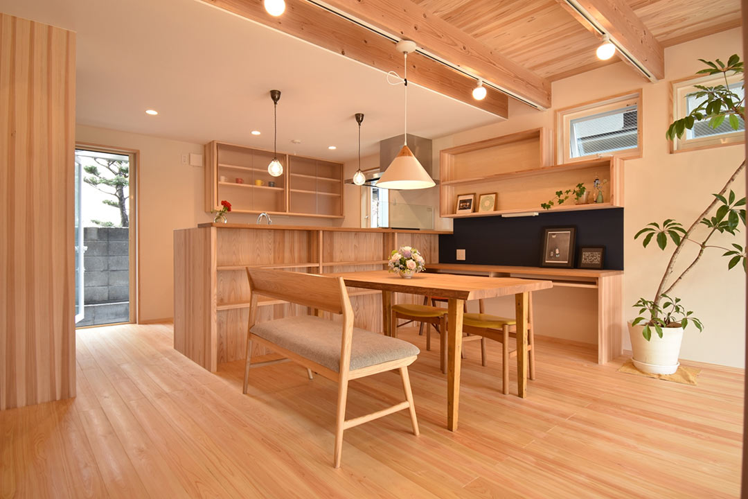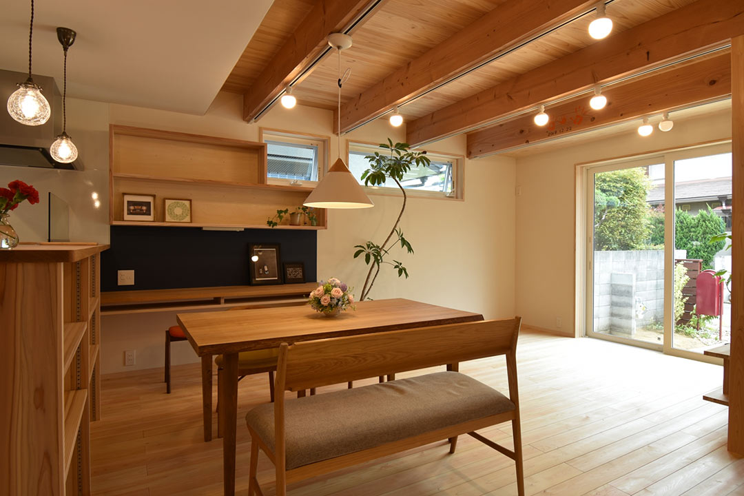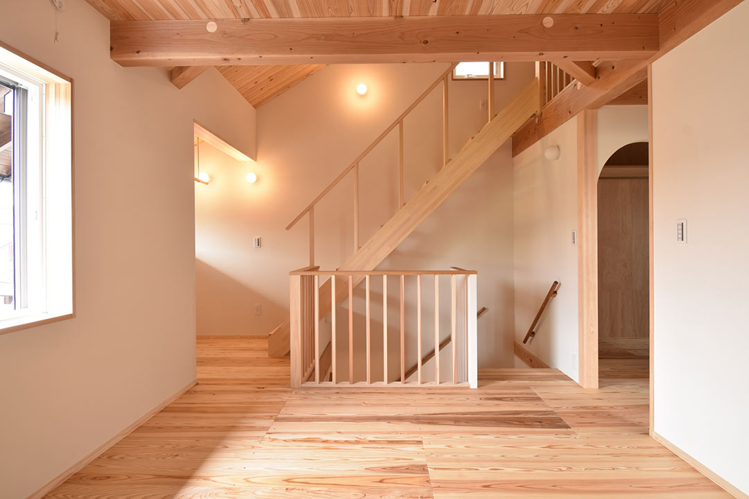 初めて住暮楽さんのお家に行ったのは、二年前に行った以前同じ場所で勤務していた上司の方のお家でした。玄関に入った時に、木の良い香り、梁がむき出しの天井、壁や廊下の少ない間取り、全てが斬新に感じて心惹かれました。