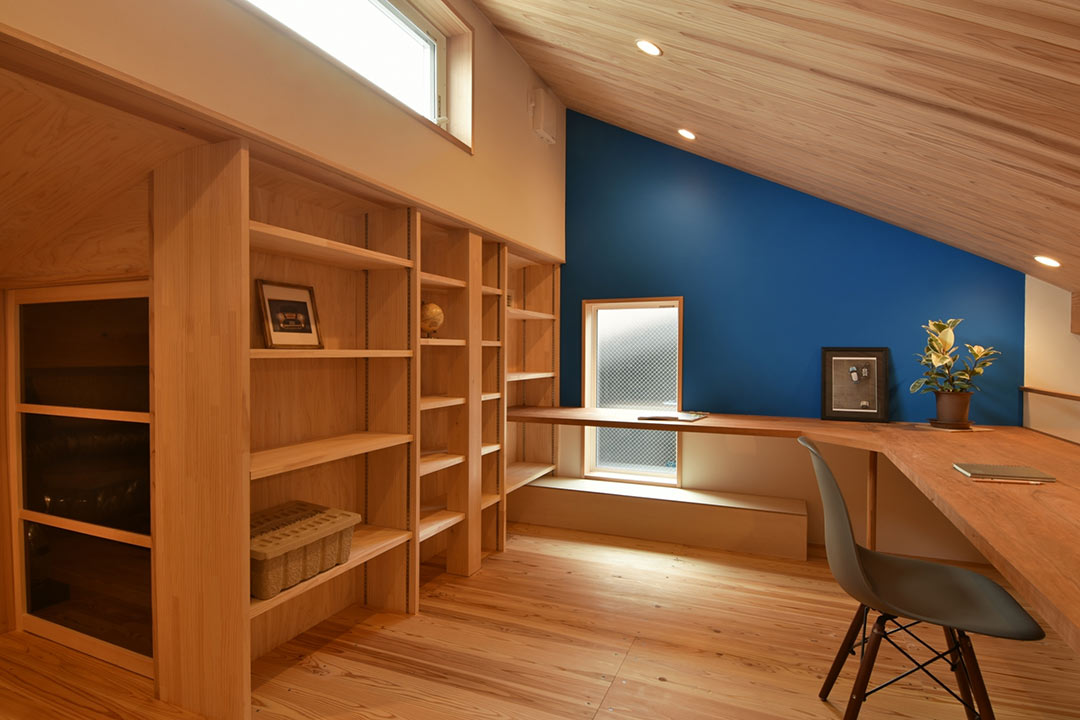 夫の仕事部屋にはたっぷり収納できる棚が。吹き抜けになっているので別々の部屋にいても声が聞こえる。のぞき込めば顔も見える。